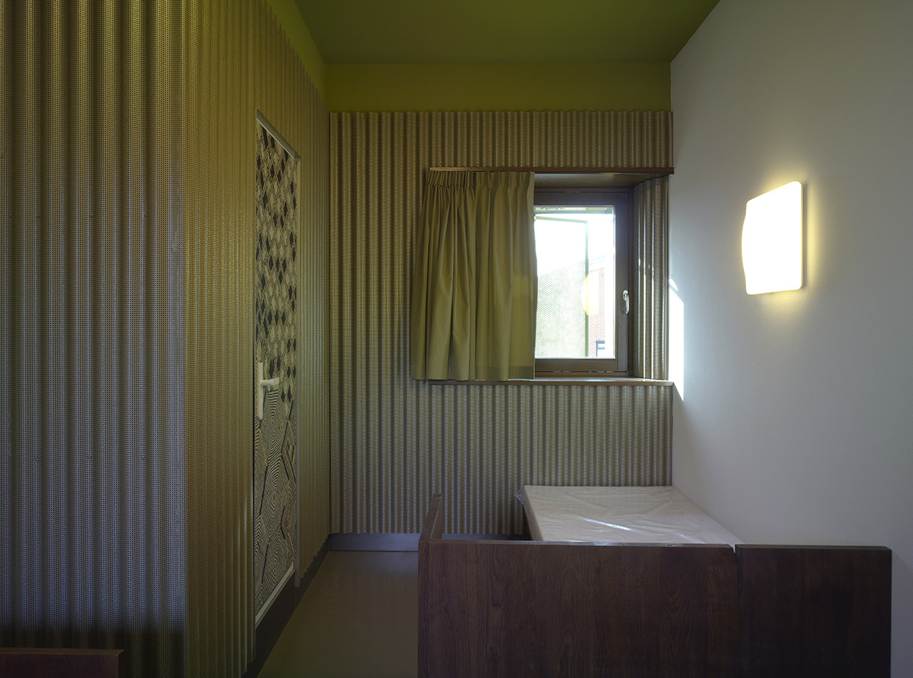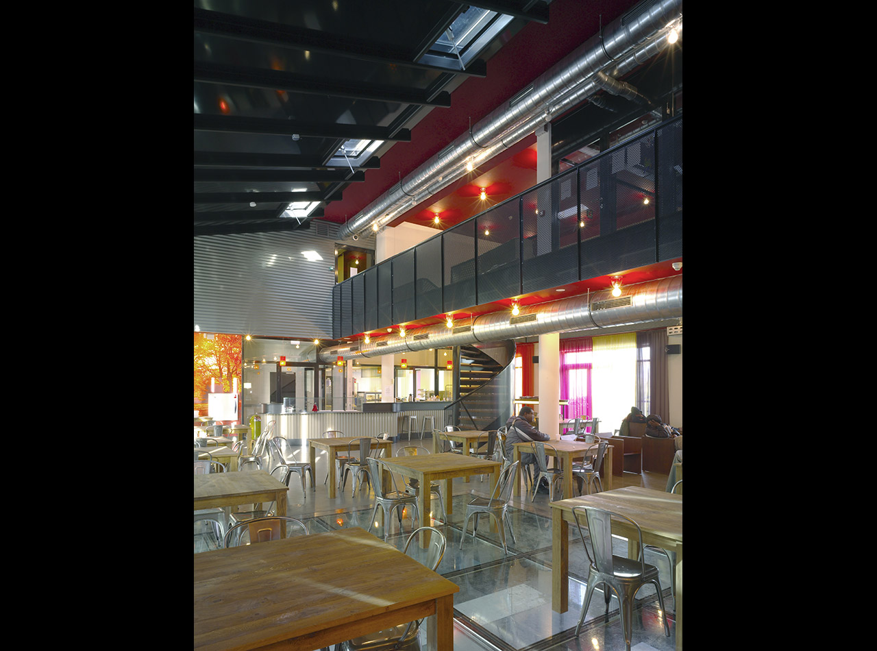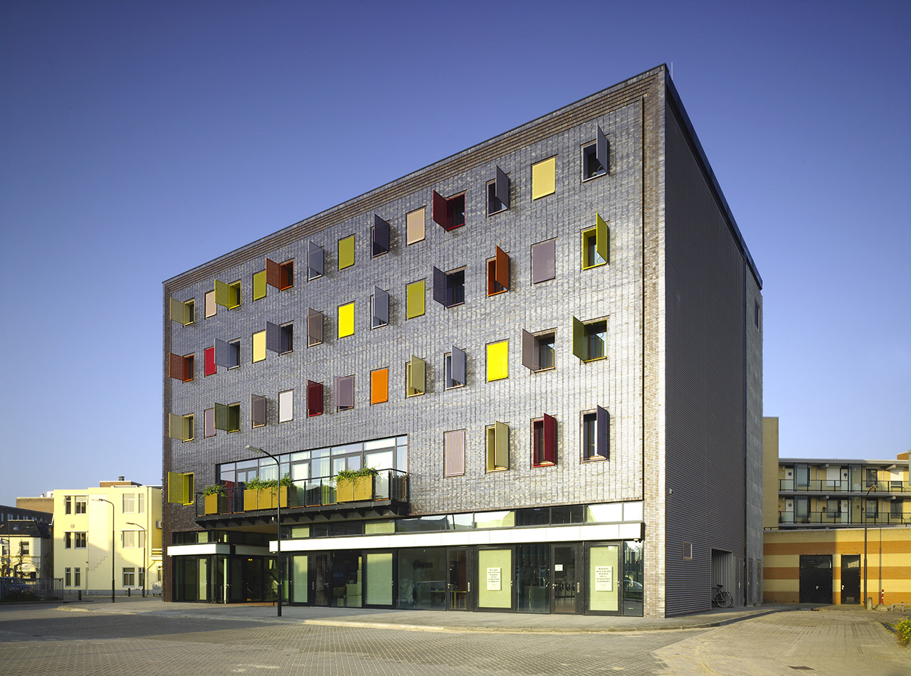 In the centre of the complex a huge entrance hall opens up to the exterior. On the first floor around the void of the hall a roofgarden is projected, at which a Grand Cafe is situated. The 100 beds in their different size dormitories occupy the second to the fourth floor of the building and are grouped around an open courtyard. The courtyard is adorned with a variety of plants. The street elevations are characterised by a rythm of cheerful coloured shutters that accentuate the facade.