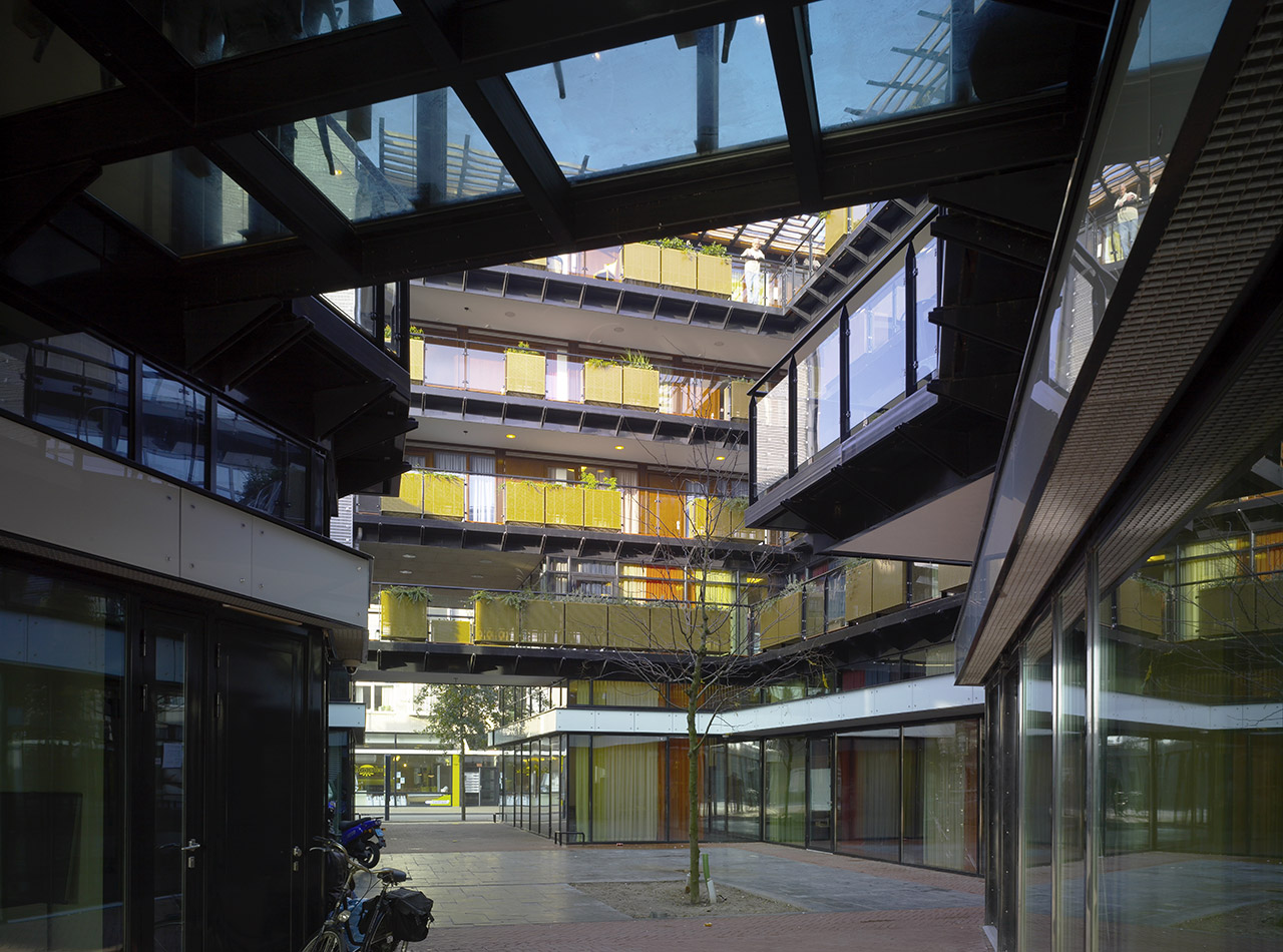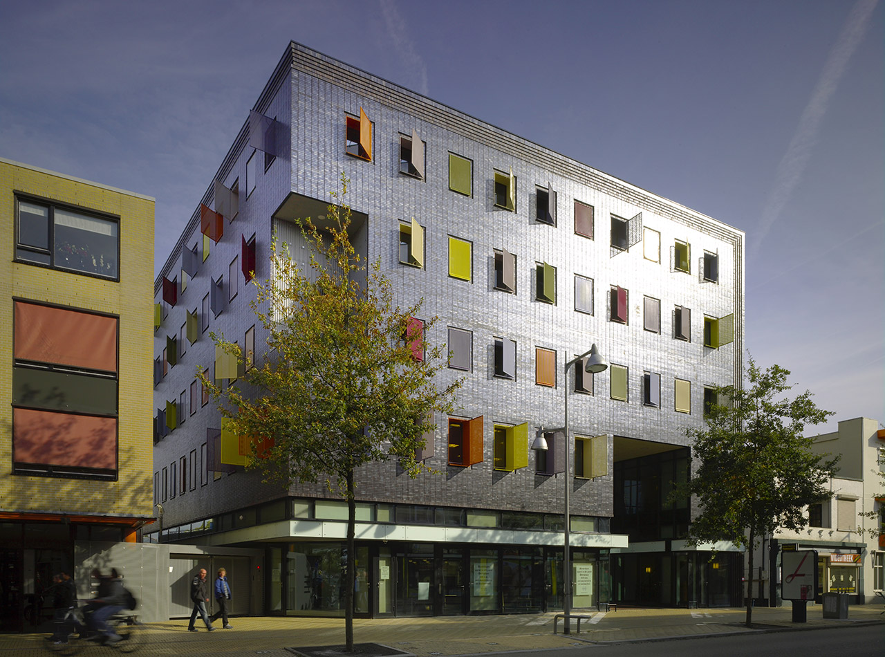The building is squeezed in between existing buildings in the centre of Apeldoorn. Because it adjoins both the Stationsstraat and a proposed new square, FBW had to design two main facades. A passage through the building gives access to various workshops and the great amount of glass within the facades provides maximum contact between passers-by and workers.