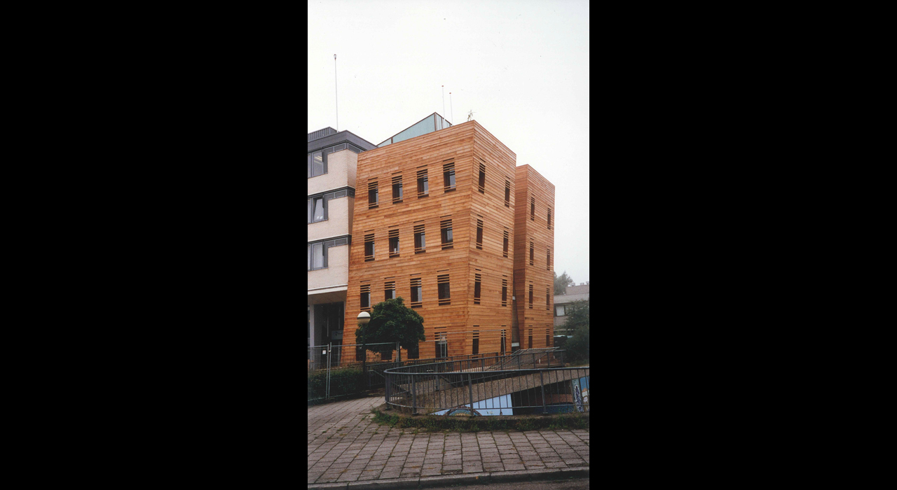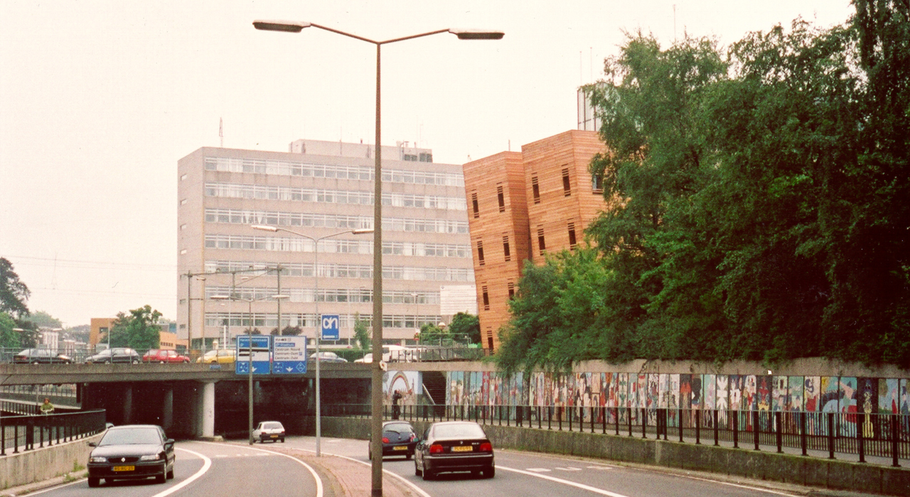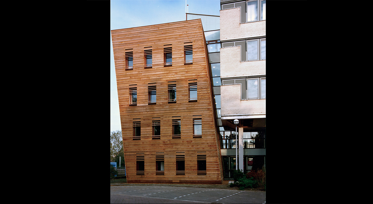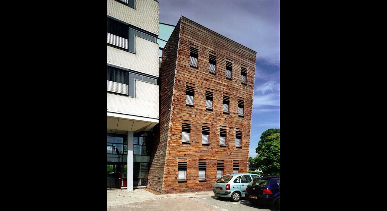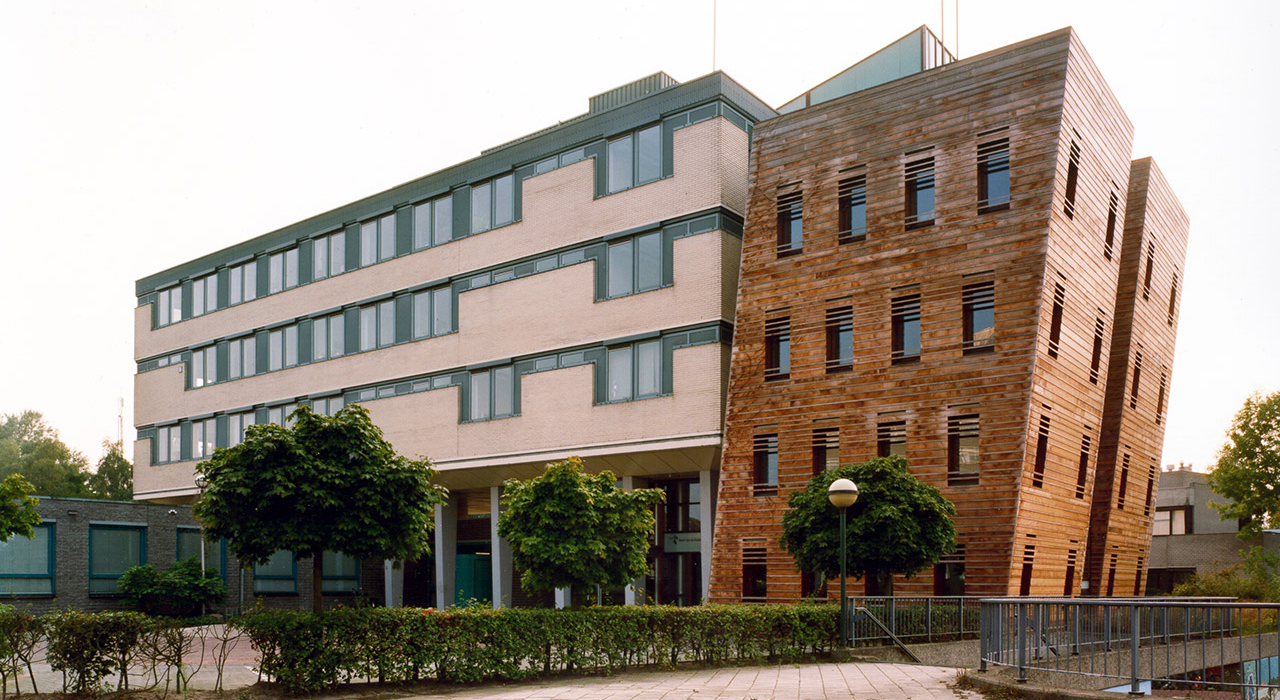 The building is situated on a cramped plot on the edge of the city centre of the city of Almelo, but cut off on one side by a railway line and on another side by a highway. The answer to this challenging situation is found in adding a pending tower, leaning over the adjoining highway tunnel access ramp. This pending gesture is a reverence to the existing building and opens up the connection to realize a transparent, glazed welcoming hall for the visitors.