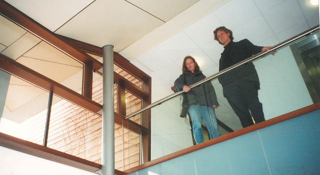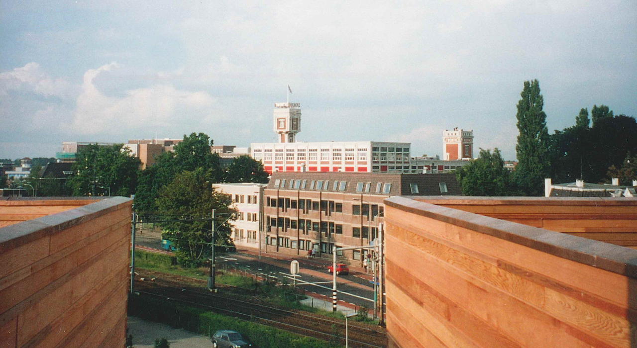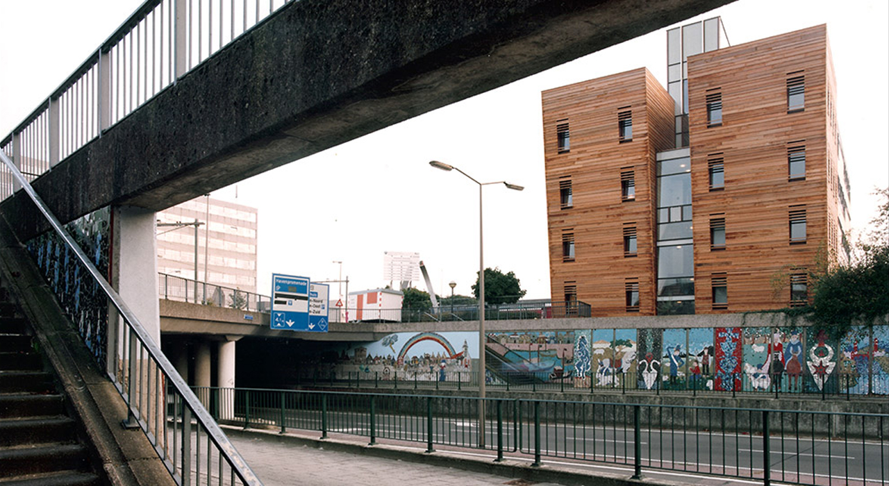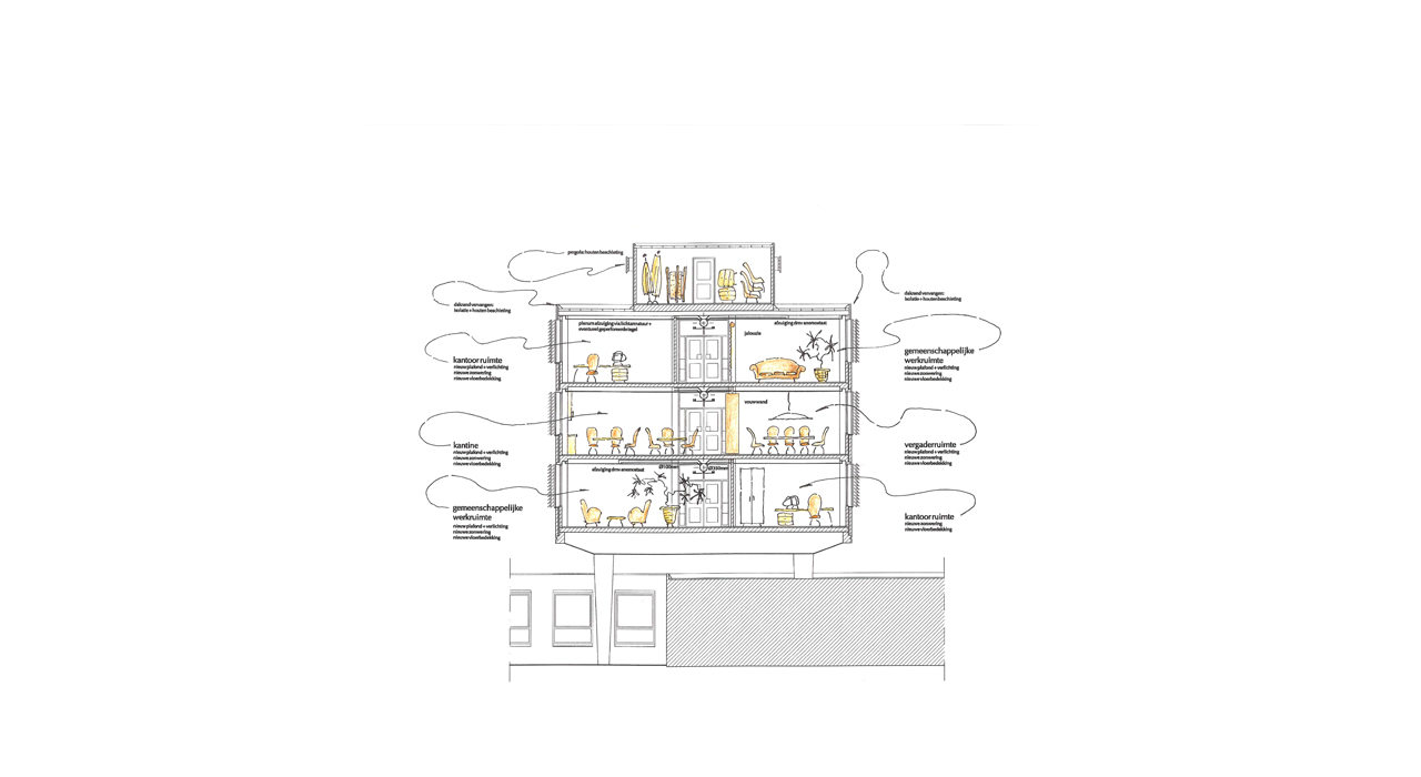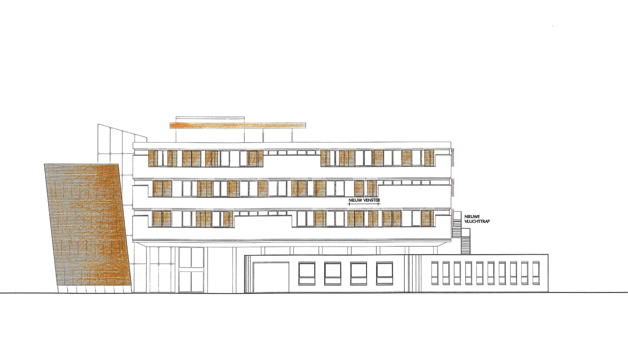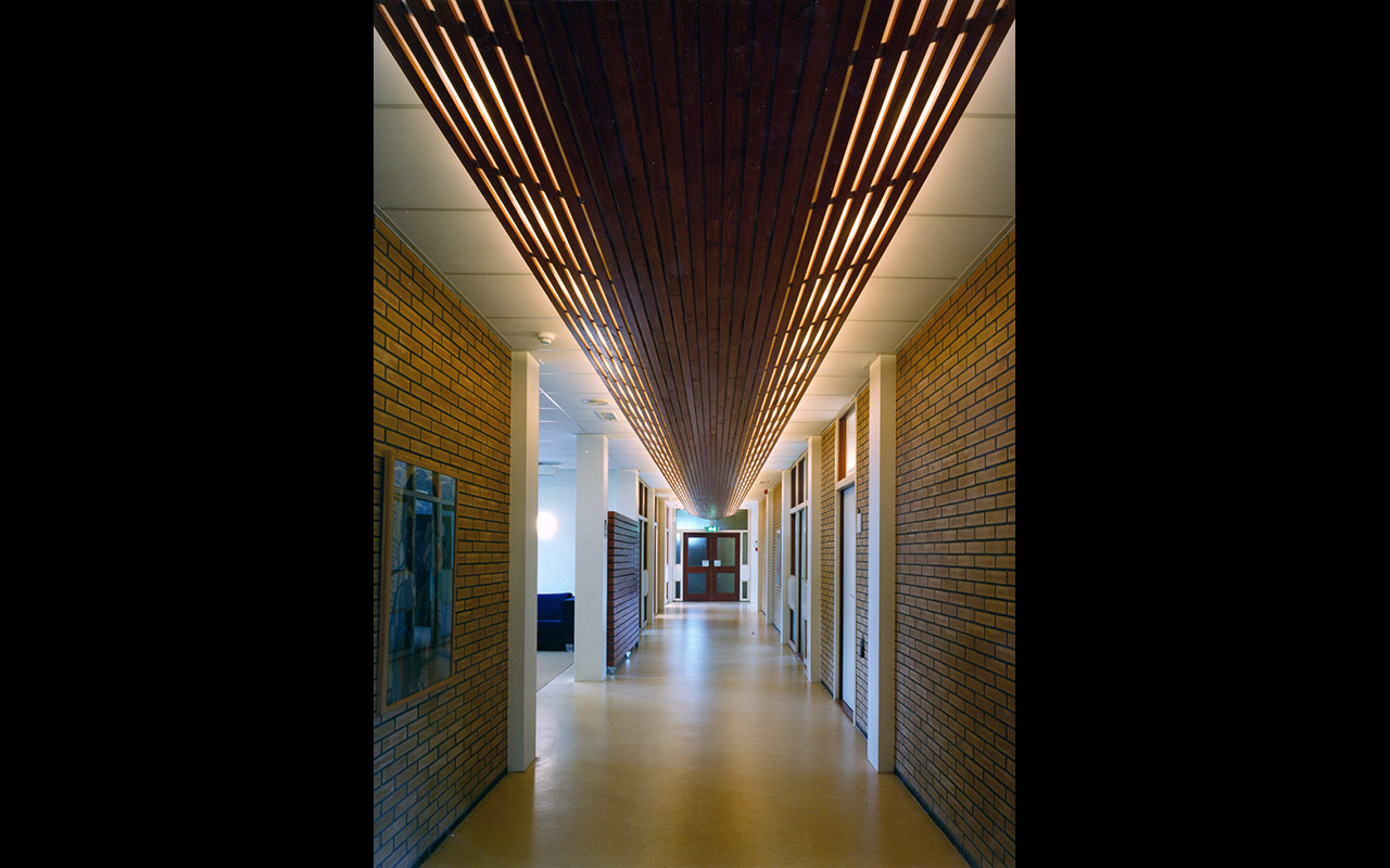 The building is situated on a cramped plot on the edge of the city centre of the city of Almelo, but cut off on one side by a railway line and on another side by a highway. The answer to this challenging situation is found in adding a pending tower, leaning over the adjoining highway tunnel access ramp. This pending gesture is a reverence to the existing building and opens up the connection to realize a transparent, glazed welcoming hall for the visitors.