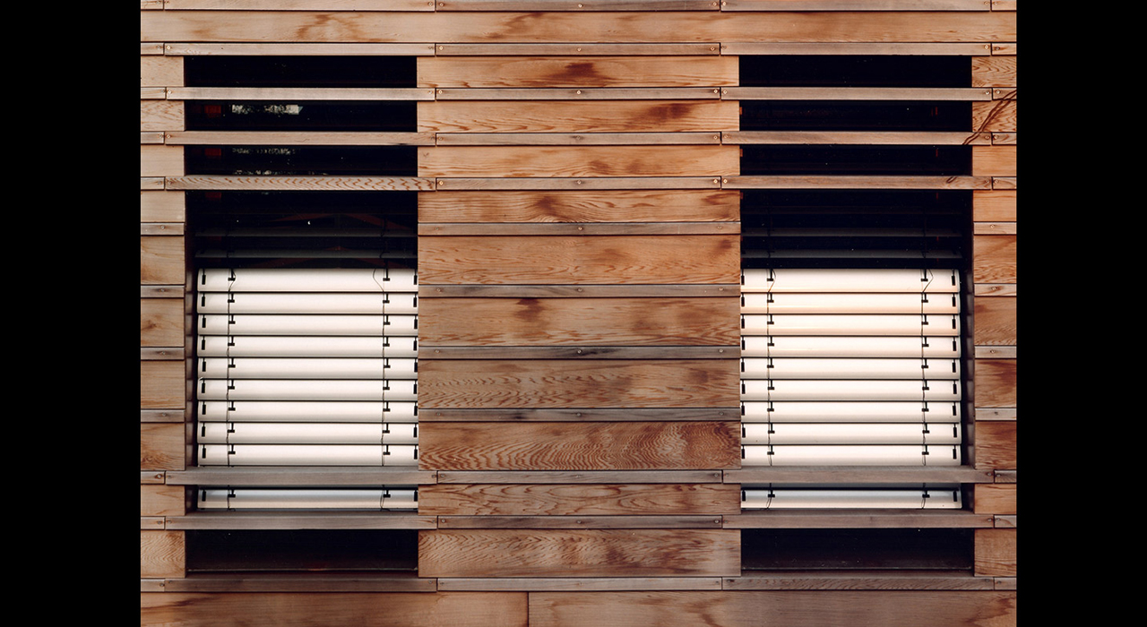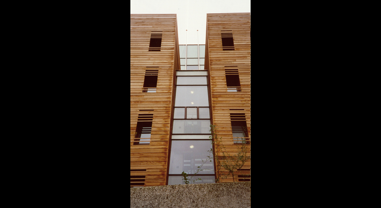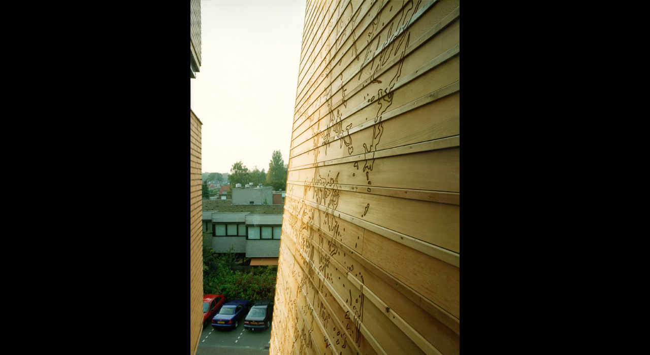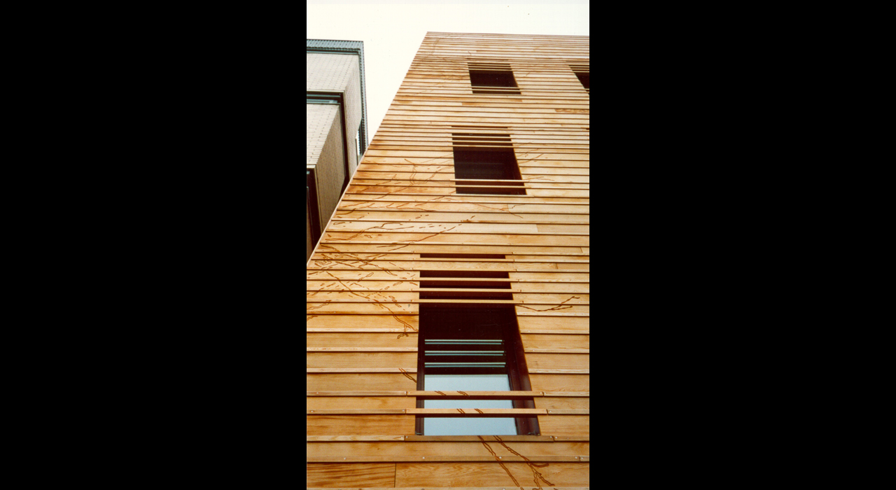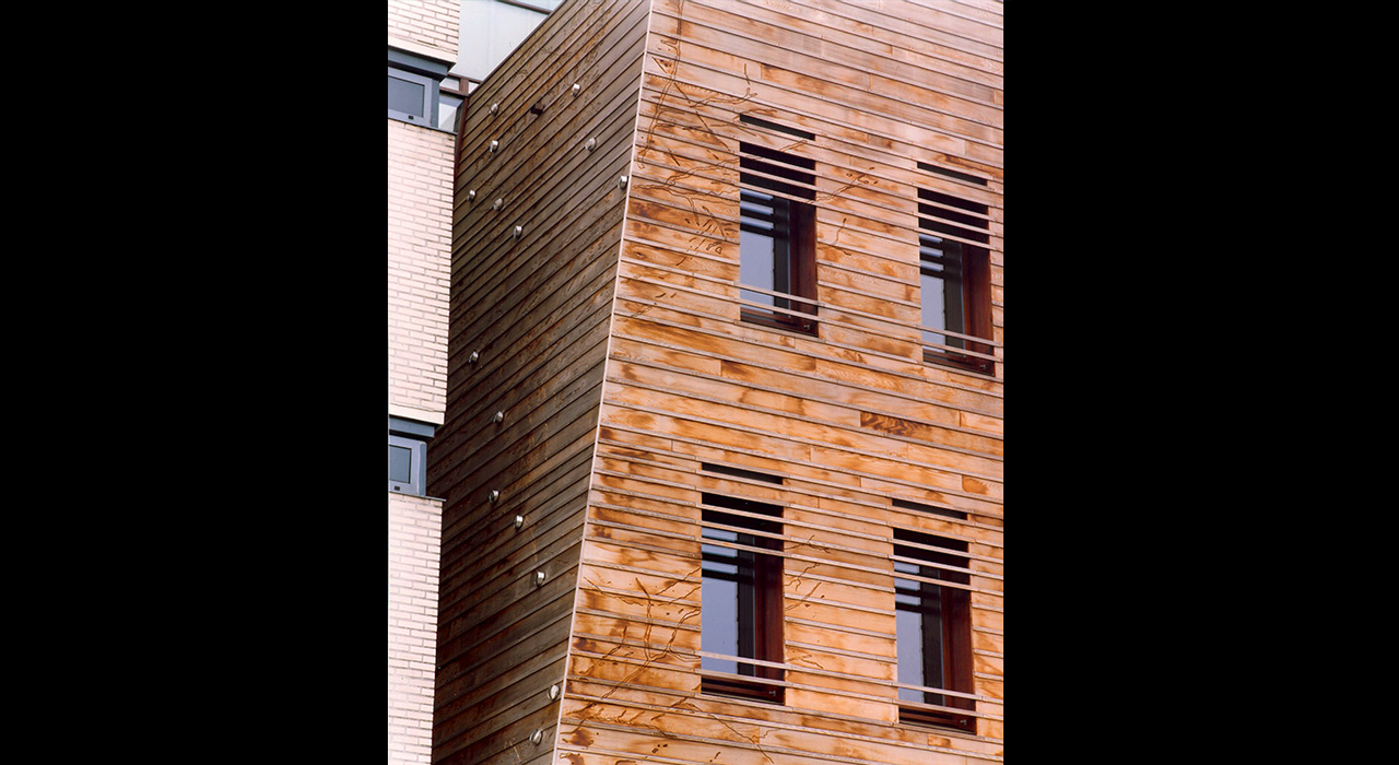 The tower cladding is designed in timber, but not ordinary timber. The wood used in the design is softwood, that has been boiled under pressure to achieve high preservation qualities. As the characteristics of the material were not know at the time, the planks are not directly fixed to the sub structure but clamped between protruding strips.