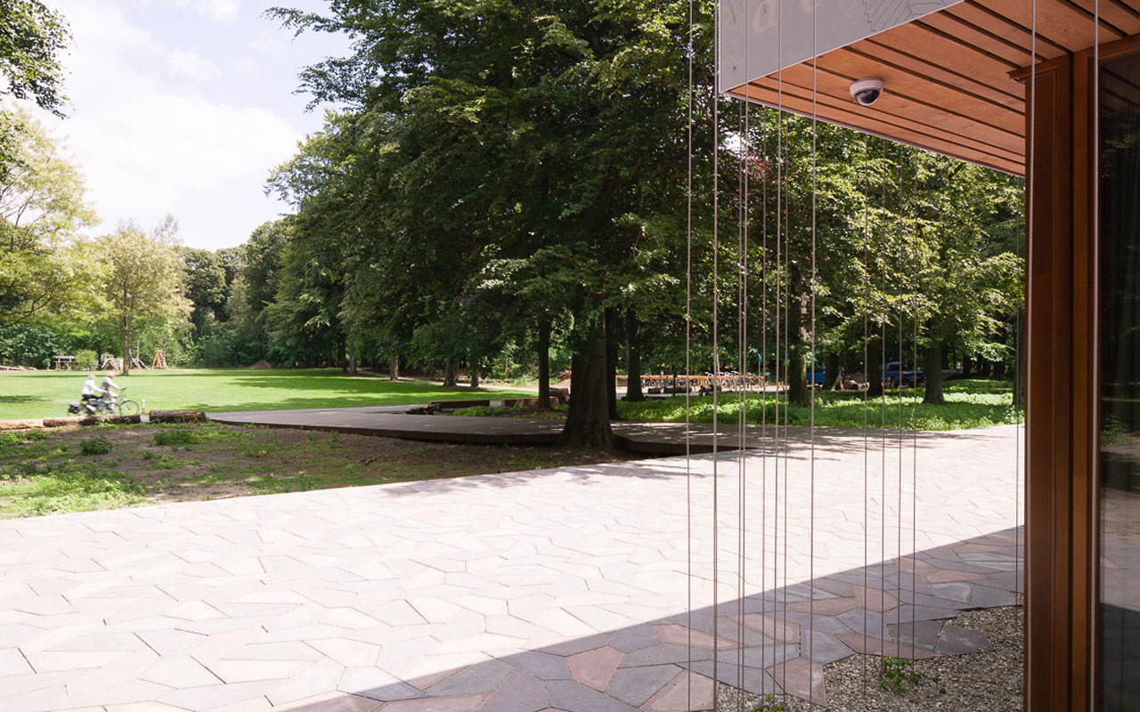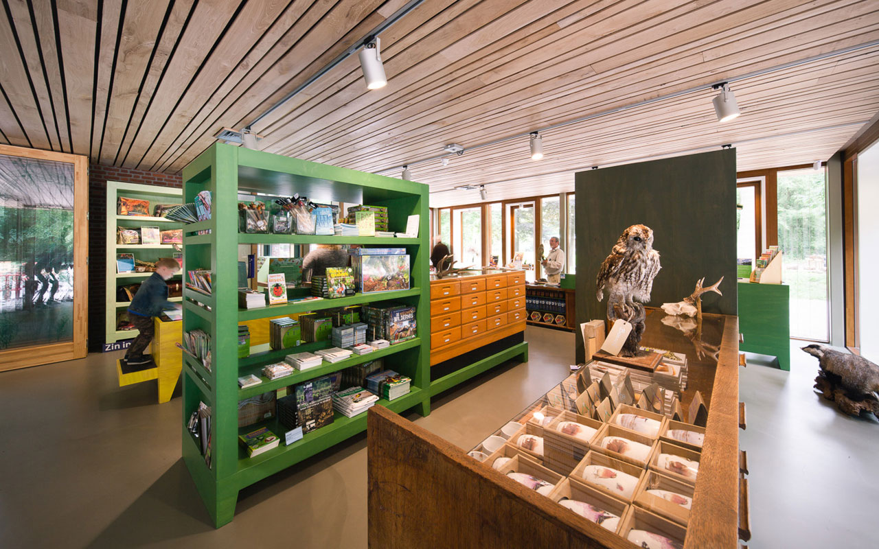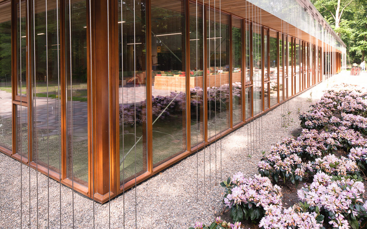 The facades of the centre are executed in oak wood with maximum transparency, protected against the sun impact by a modest roof overhang. The eave of the roof is in glass and decorated with a fragment of text written by Jacque P Thijsse, one of the founders of the organisation. In front of the glass, rust free steel cables extend from the eaves into the ground and serve as support for climbing plants. All elements combined make for a multi-layered facade, which results in a gradual transition from the interior of the building to the forest beyond.