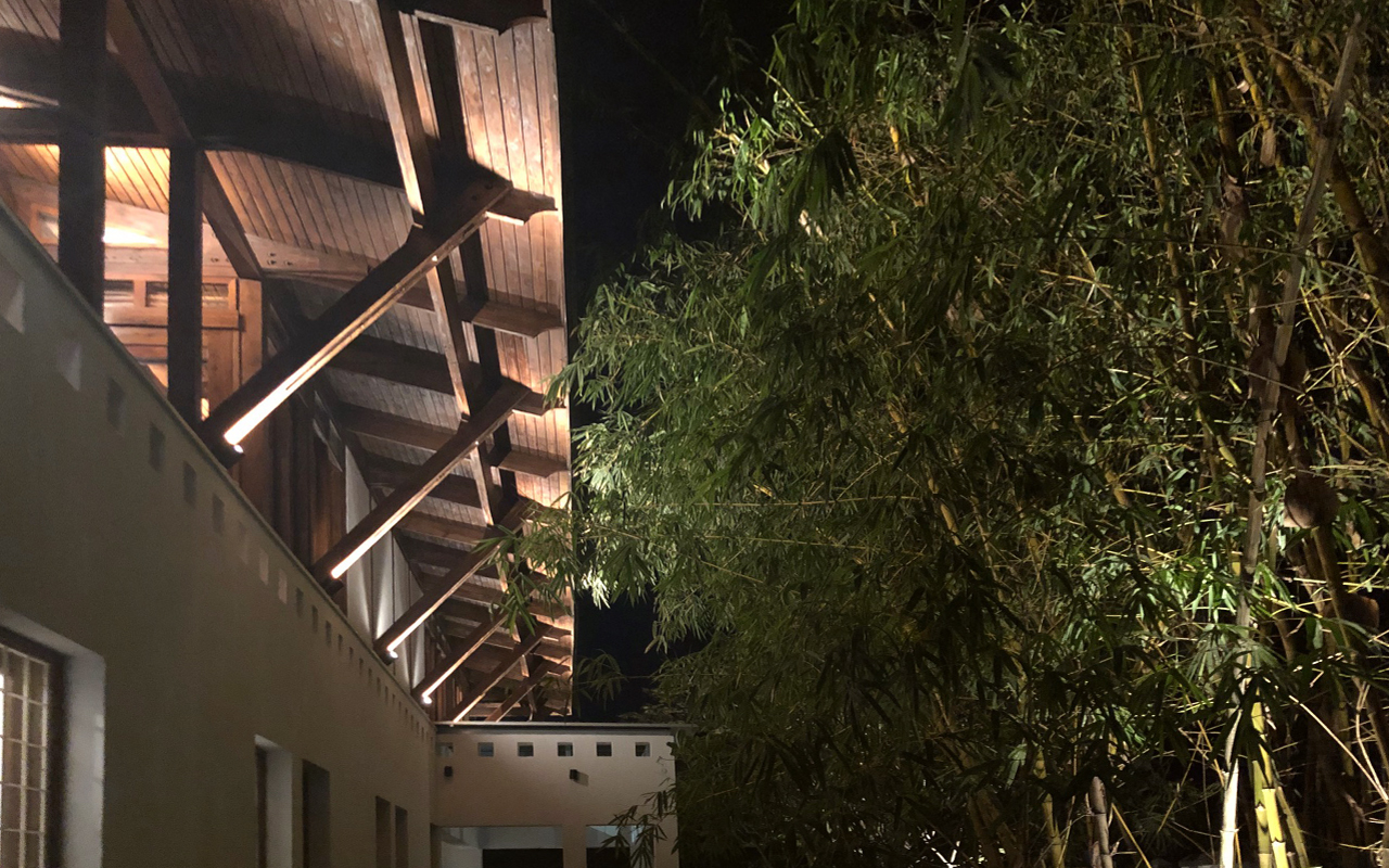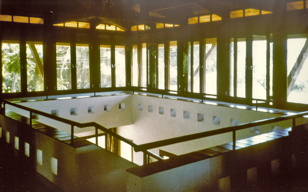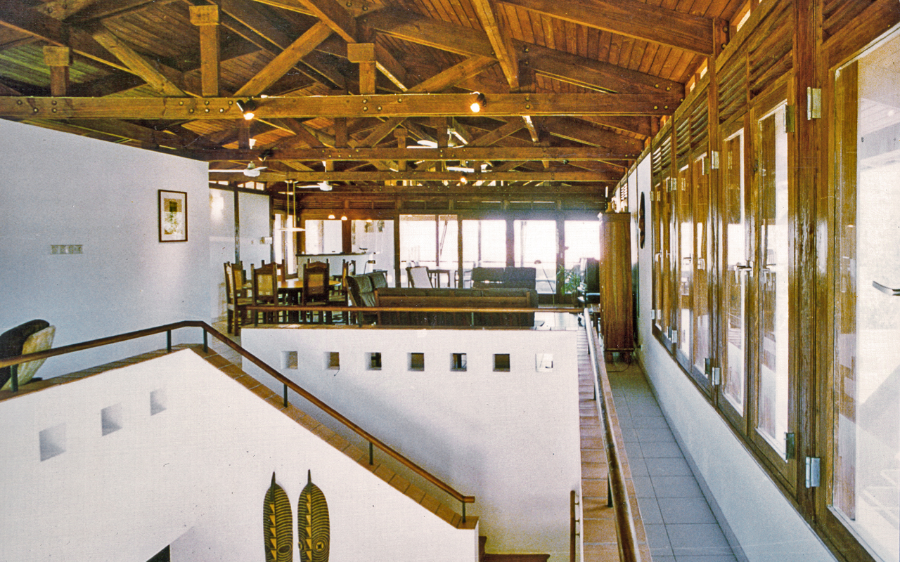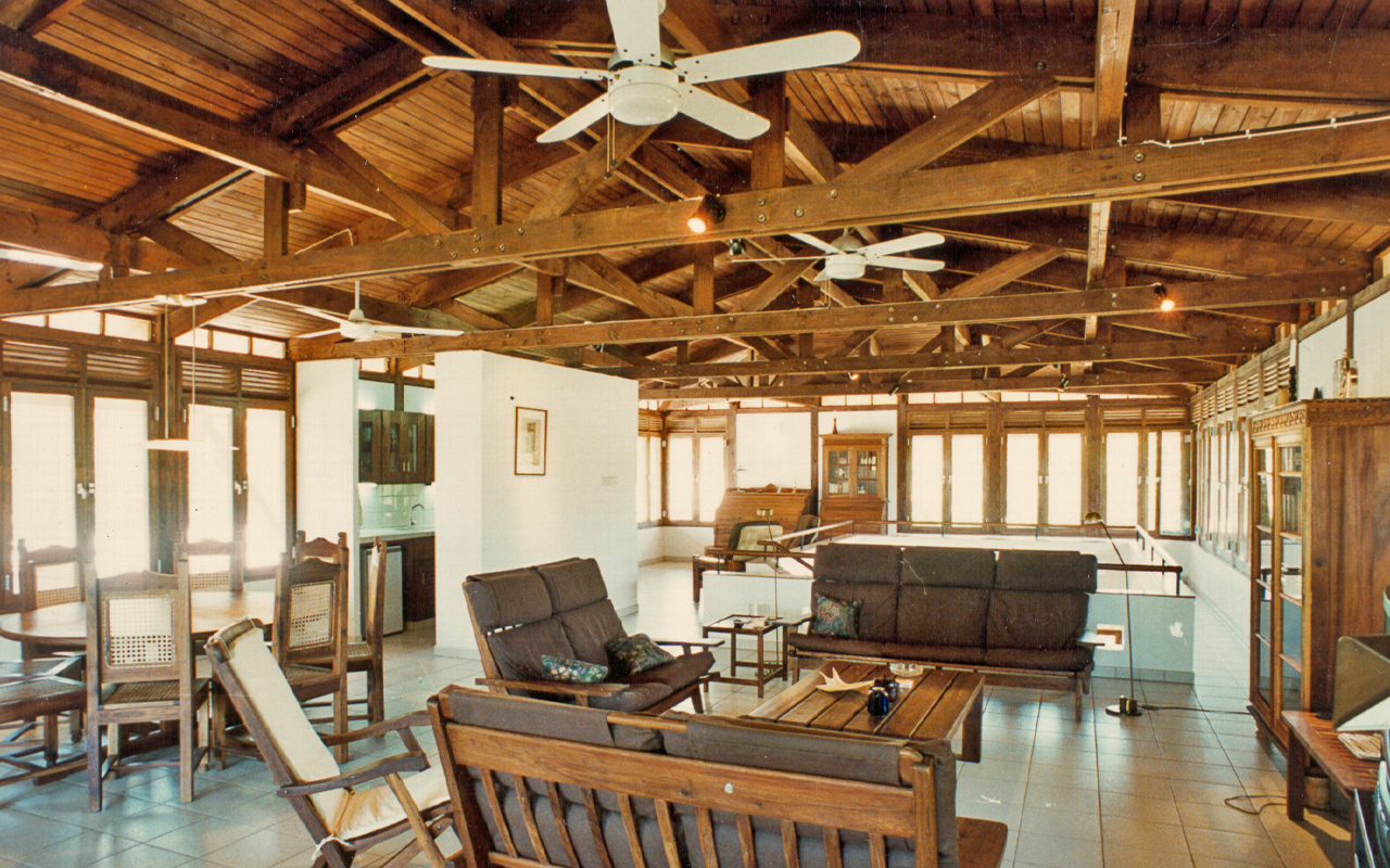 The first floor facades are almost entirely glazed and open, protected by a hipped flying roof with deep eaves, preventing the sun to penetrate. The roof is clad in copper, which was affordable as the copper price had hit the floor in the early 1990s. the entire first floor structure is exposed and timber framed.
