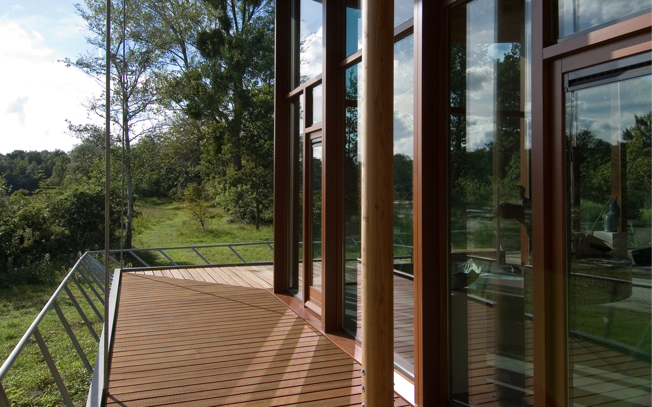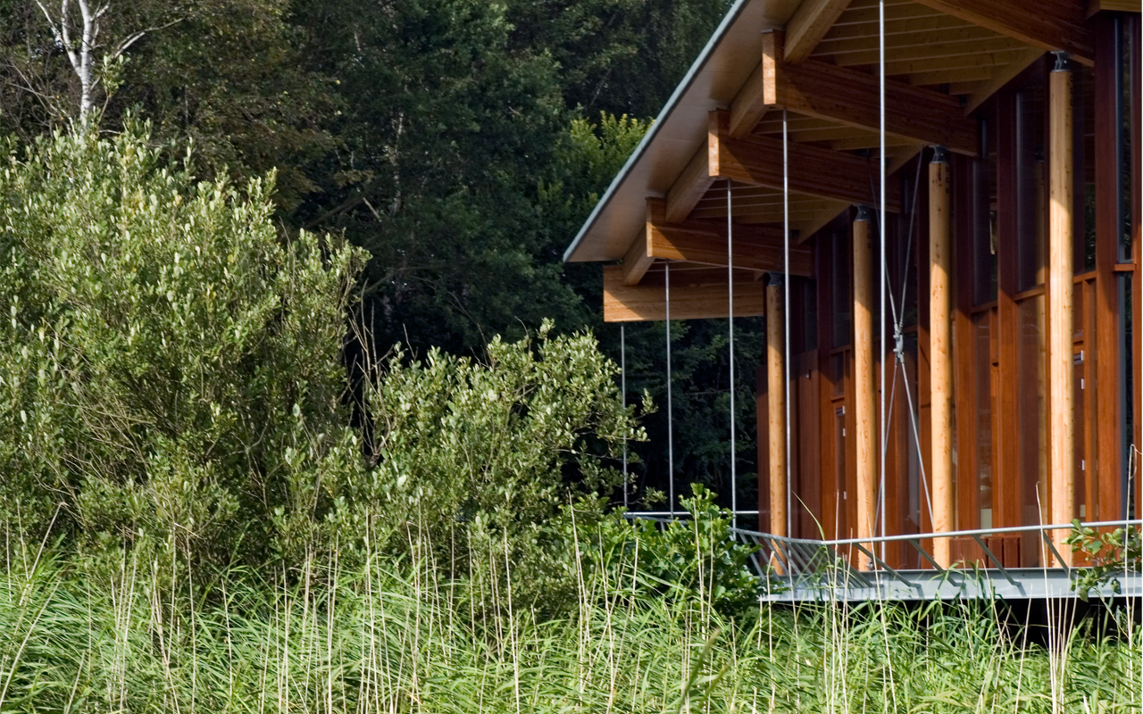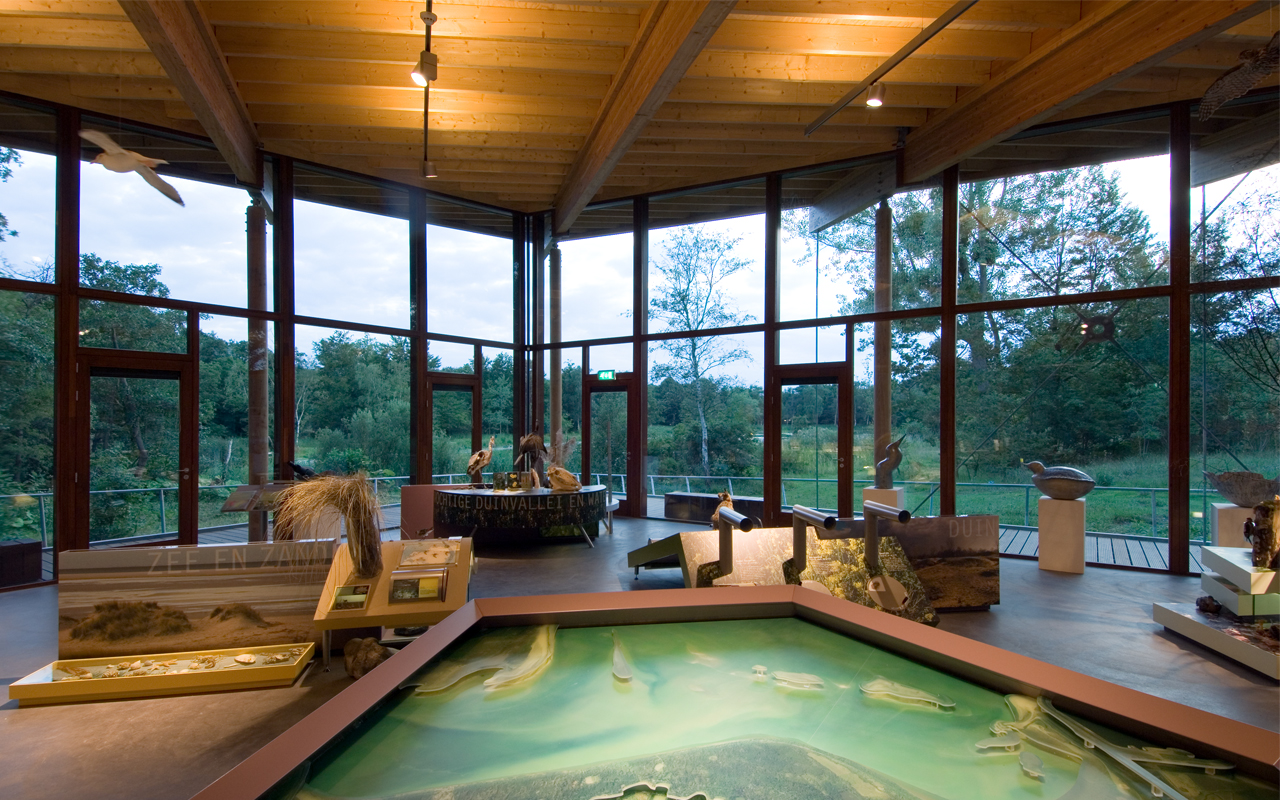 The structure of the building is built out of timber columns and beams, with large roofoverhangs. From the veranda visitors can admire the view towards the orchid garden and the dune lake. The veranda is suspended from the timber beams that protrude from the elevations. The roof is suspended from the facades by a glass strip and looks like it is floating.