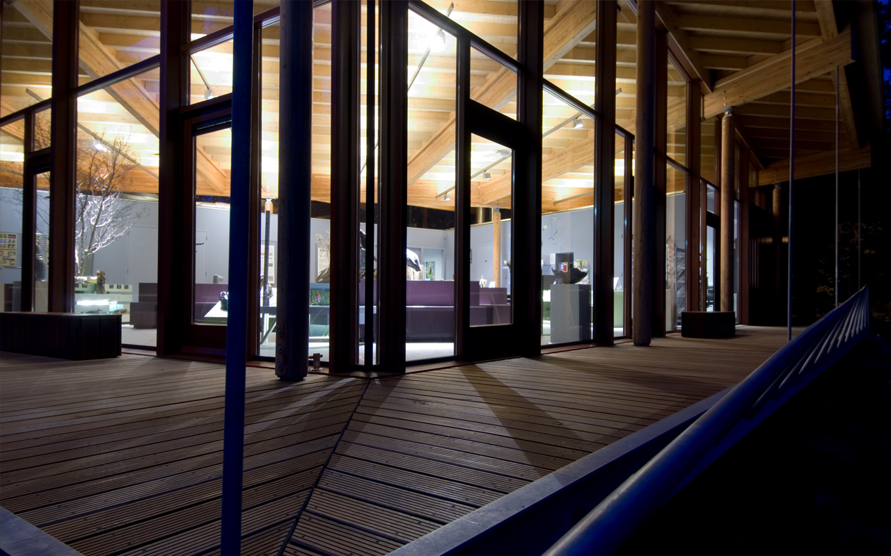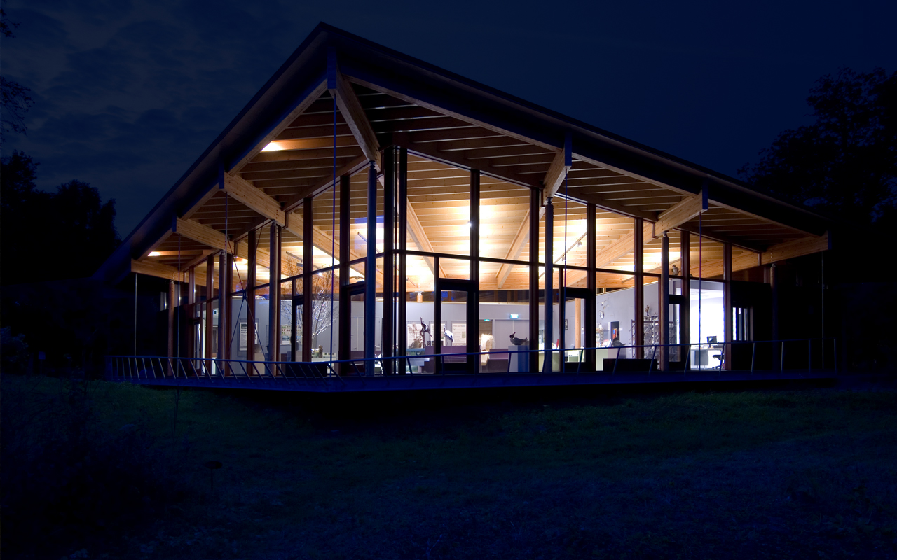 From the inside, the timber structure of the building is kept visible like the skeleton of a whale. The program provides for exhibition space, meetings, offices, kitchen and workshop. With the floating veranda and the toppling of the roof a dynamic building emerges, with a different face on all sides.