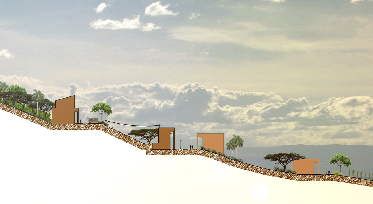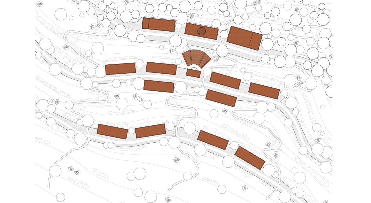 The relationship between Butiama City Centre and JNUST is of high importance and is seen as symbiotic where optimal use is envision between the existing and future potential of the city as regional hub. The campus is organized along three longitudinal terraces that are distinctive clusters through their facilities: public services and main buildings, research and teaching facilities and lastly outreach and practical training facilities.