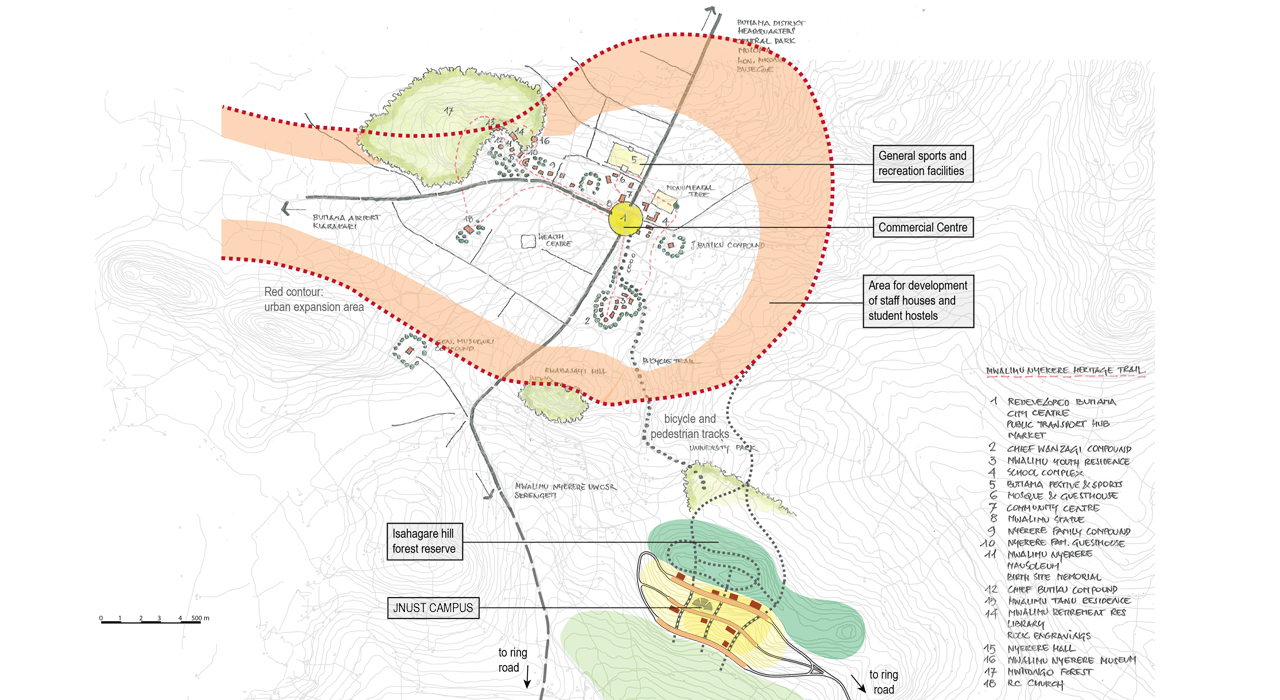 The spatial framework of the proposed JNUST development is unfolded on six scale levels from regional to township to campus that together form a proposed diagrammatic concept that serve as basis for the masterplan for the JNUST campus. JNUST consist of a conglomerate of schools and field stations with its central campus at Butiama.