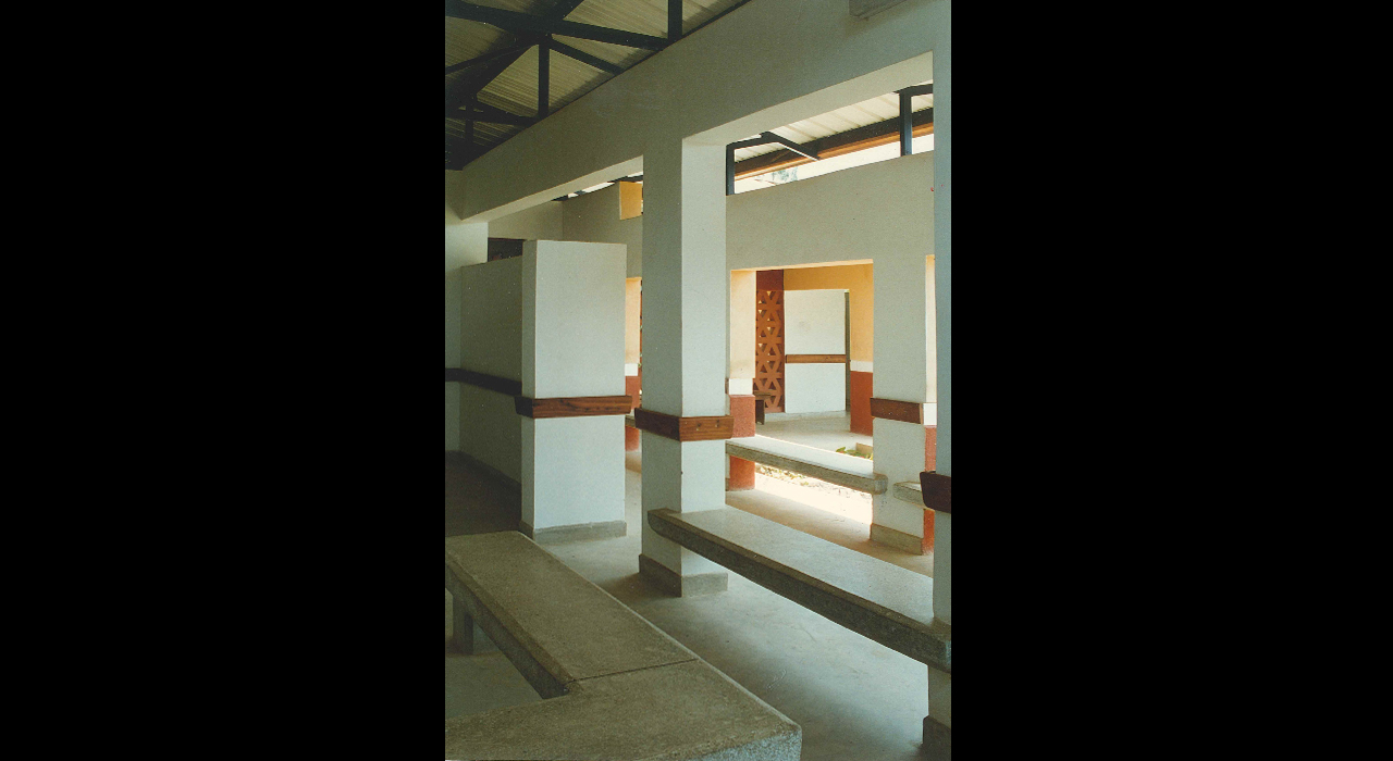 The buildings are all double-skinned, with ventilated jack roofs, and screens to protect against sun and allowing the breeze in. For the external wall finishes, a plaster with locally found pigments was applied, to provide a friendly and inviting atmosphere, and at the same time to avoid necessary (re)painting.