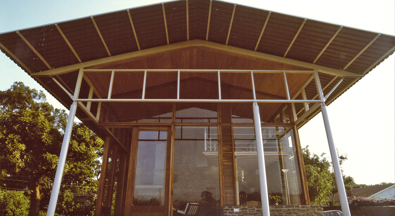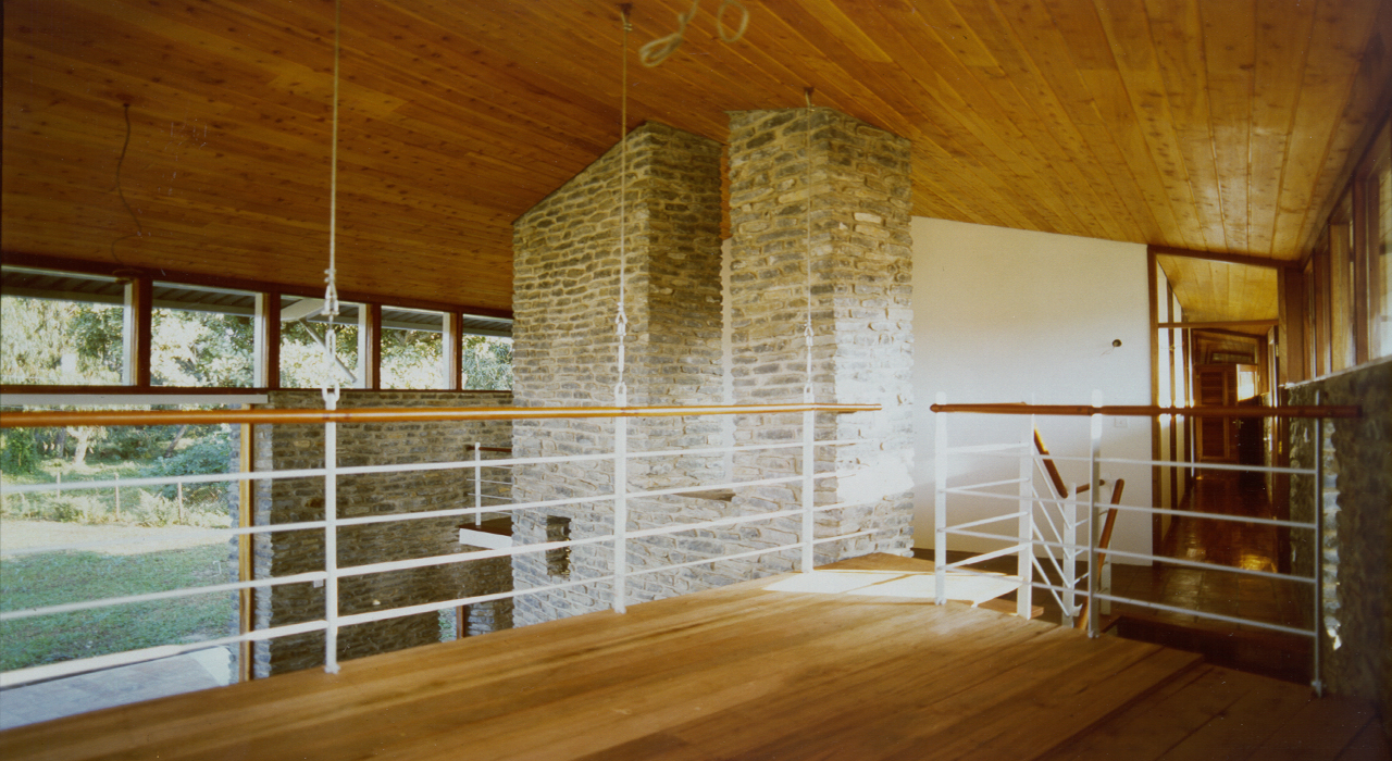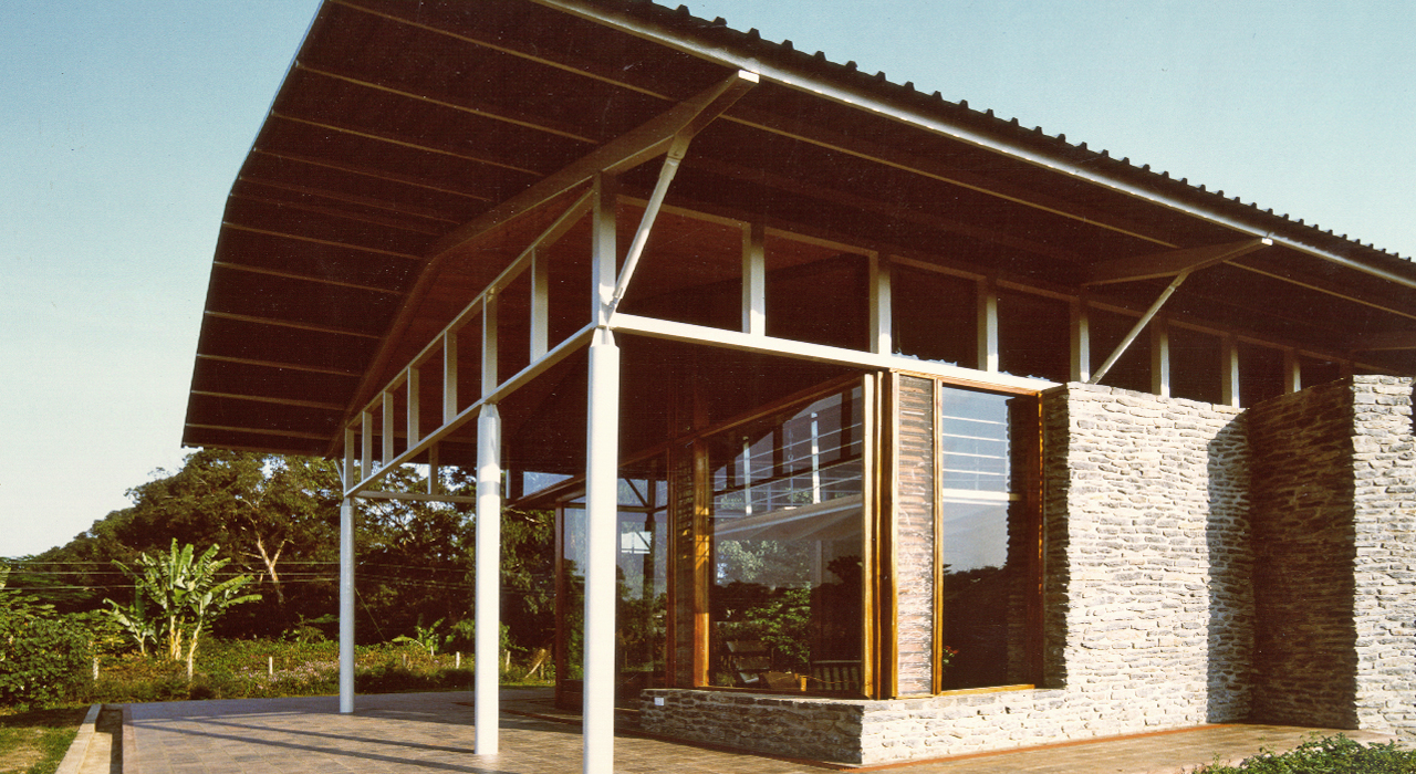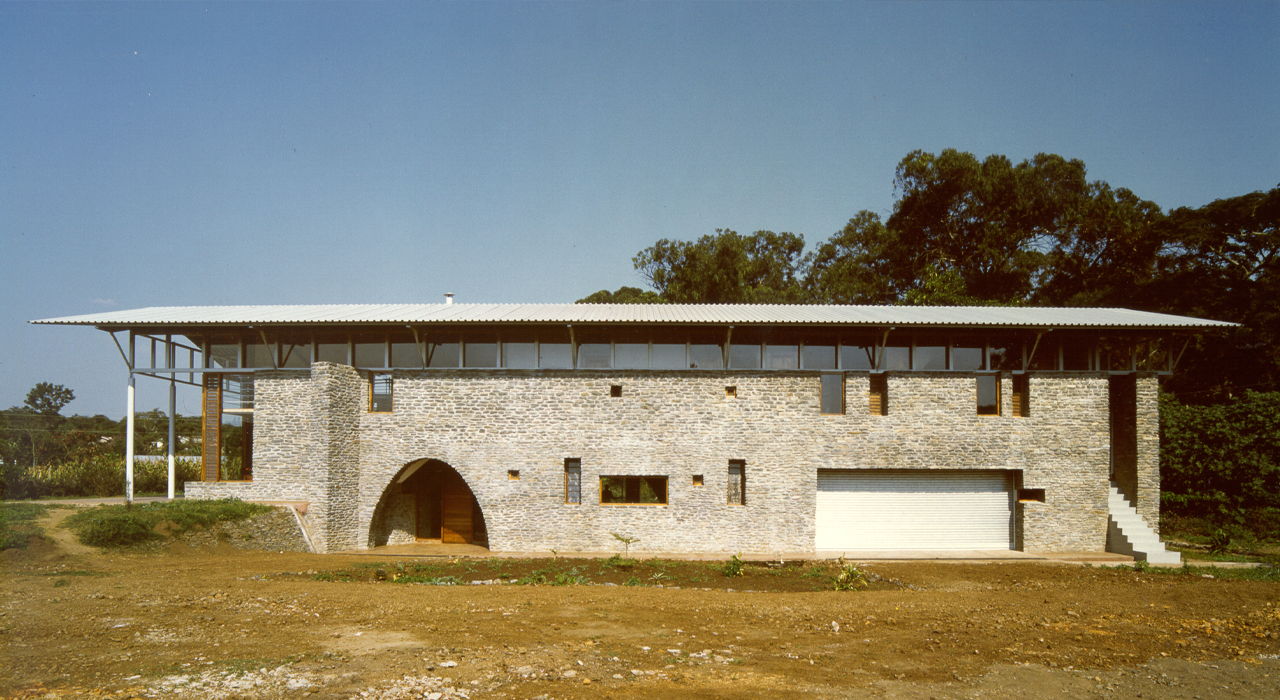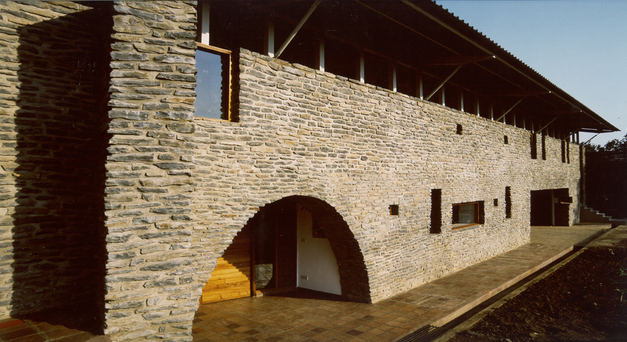 The curved roof is made out of corrugated sheets. The walls, erected out of natural stone from a quarry nearby, amount to 60 centimetres in diameter in order to be able to resist an earthquake. The house is kept together by a dominant steel structure, which makes the roof on top seem to float.  The window openings which are carved deep within the natural stonewalls have been situated where the climatic conditions within the house demand for it.